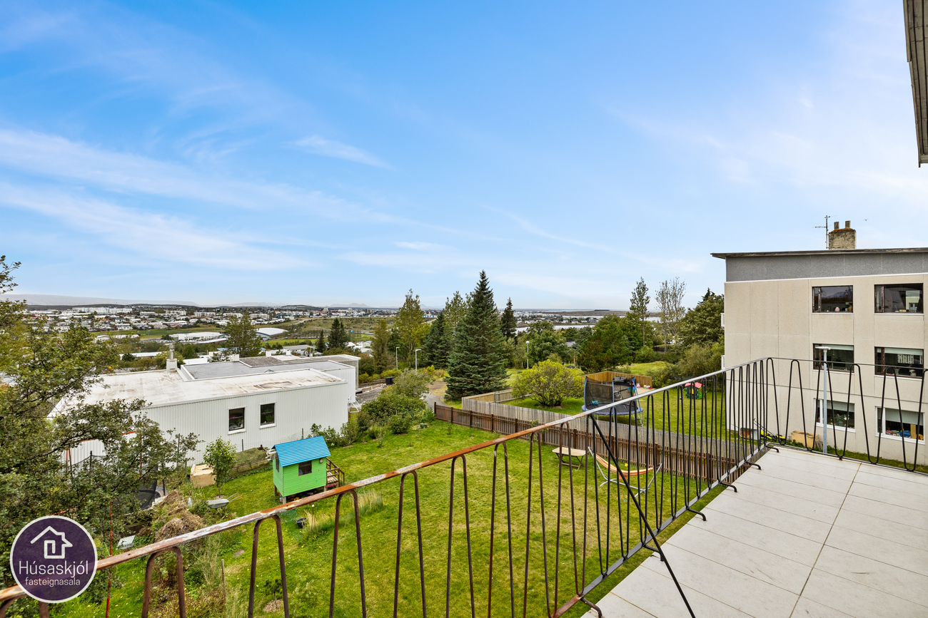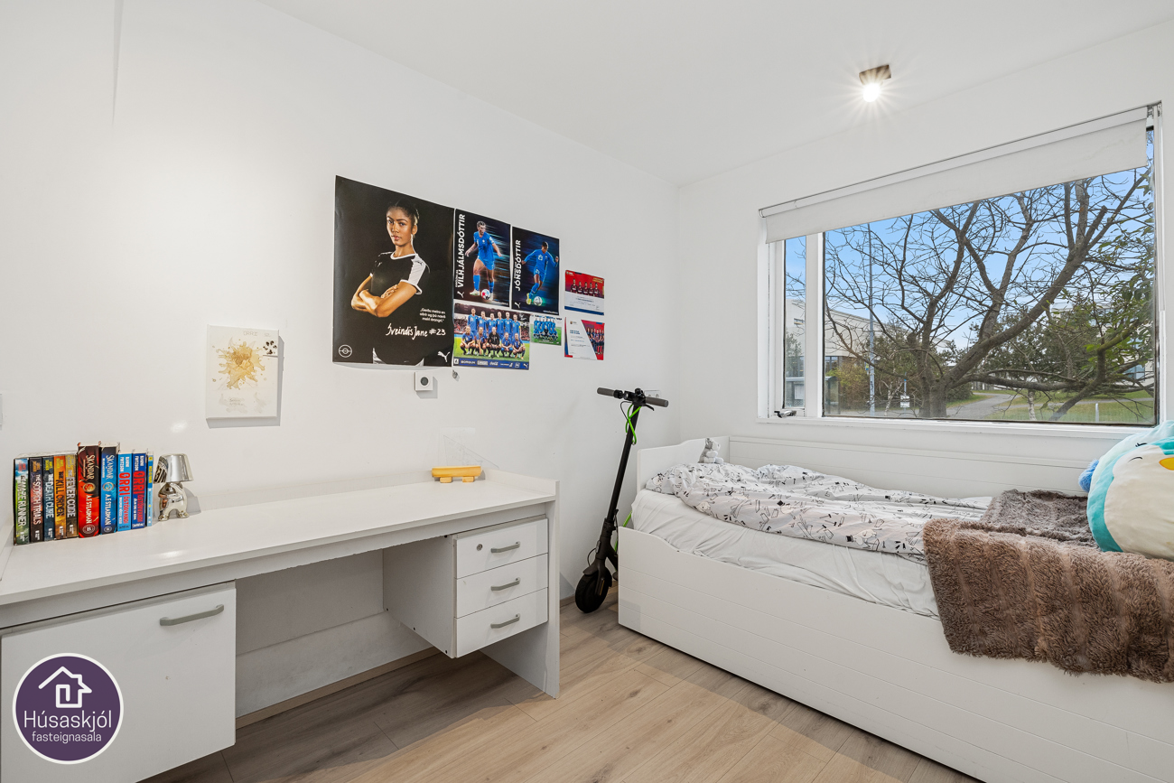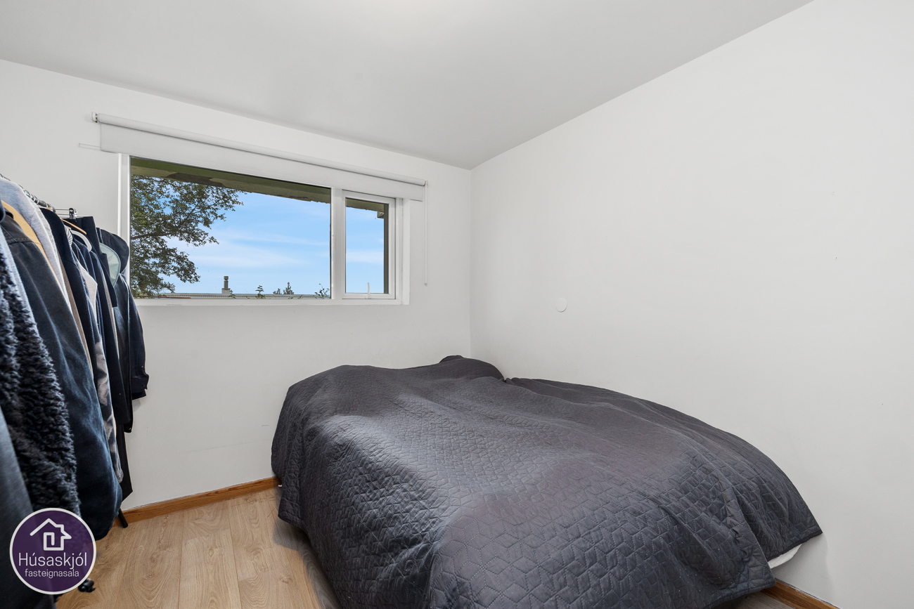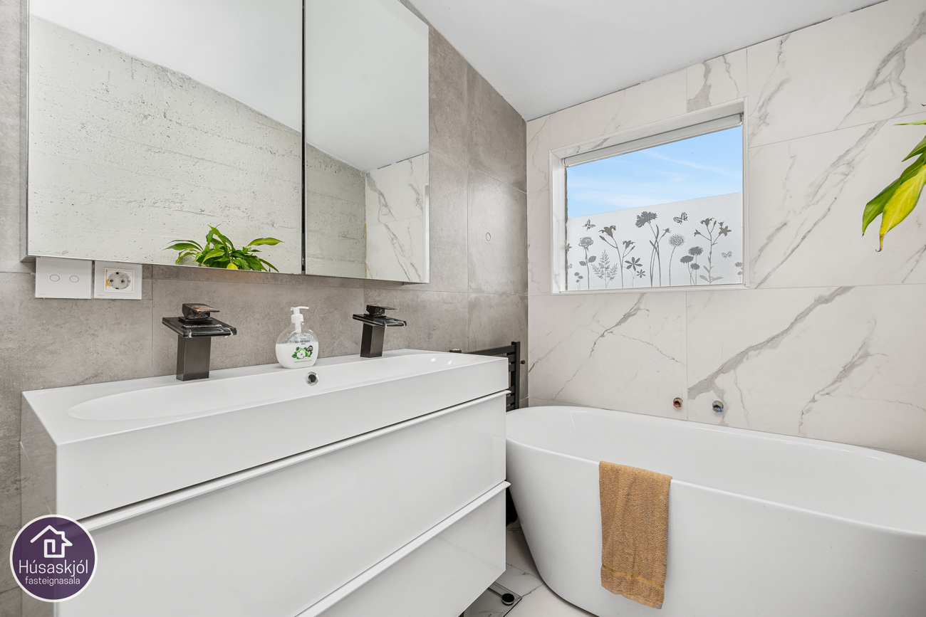Efri hæð: 3 svefnherbergi öll með harðparketi og hjónaherbergi með skápum, útgengt á suðursvalir með útsýni frá hjónaherbergi. Baðherbergi er flísalagt í hólf og gólf, sturta og baðkar, gluggi og tengi fyrir þvottavél, gólfhiti á baði, önnur rými með ofna.