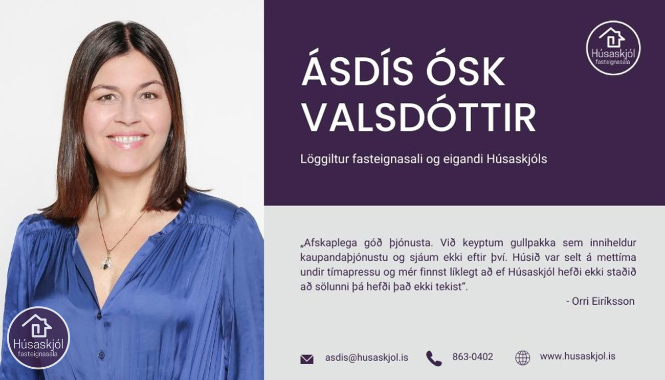 Allar nánari upplýsingar veitir Ásdís Ósk Valsdóttir löggiltur fasteignasali í email: asdis@husaskjol.is eða í síma frá 09:00-17:00 á virkum dögum: 863-0402